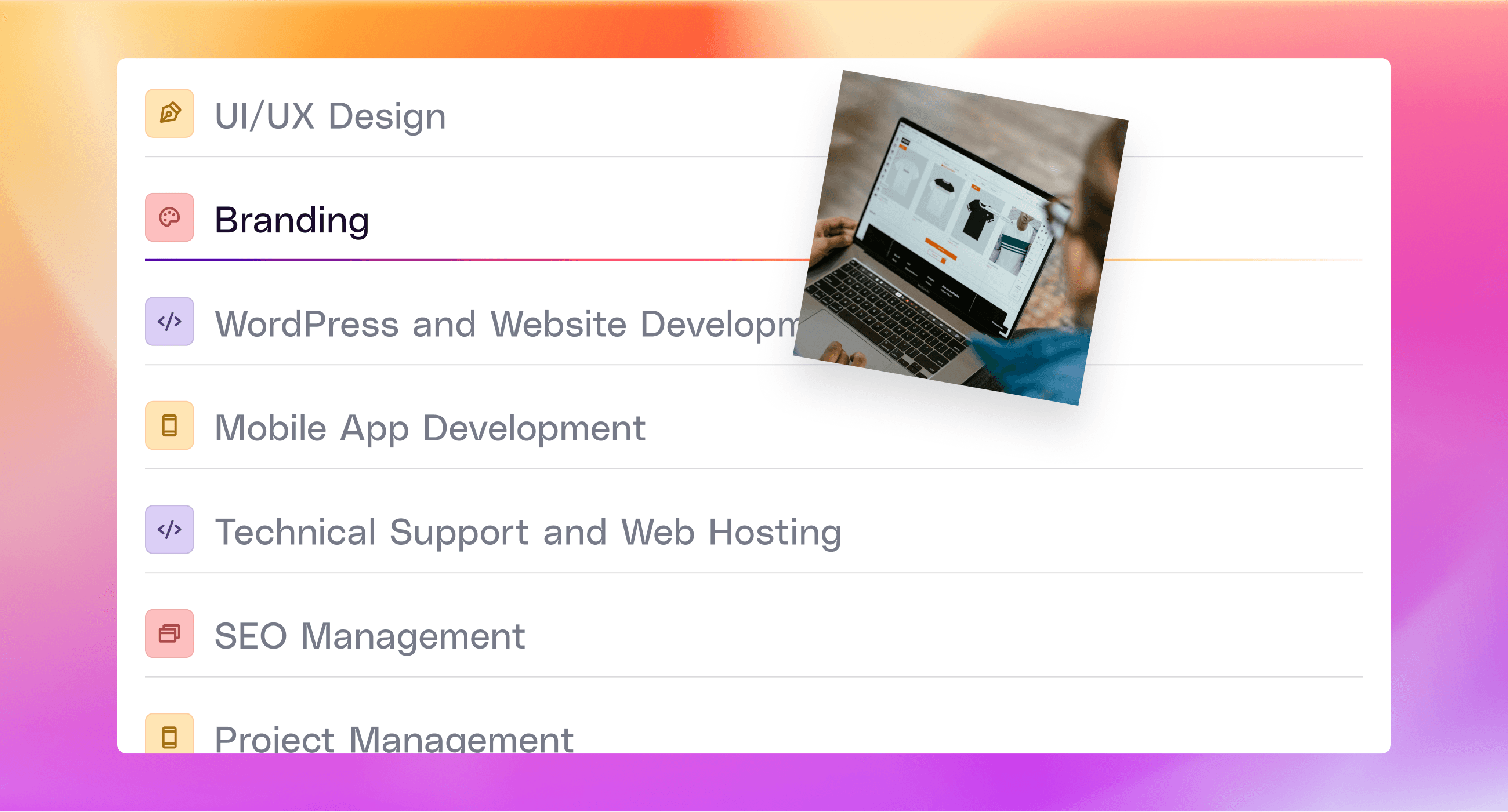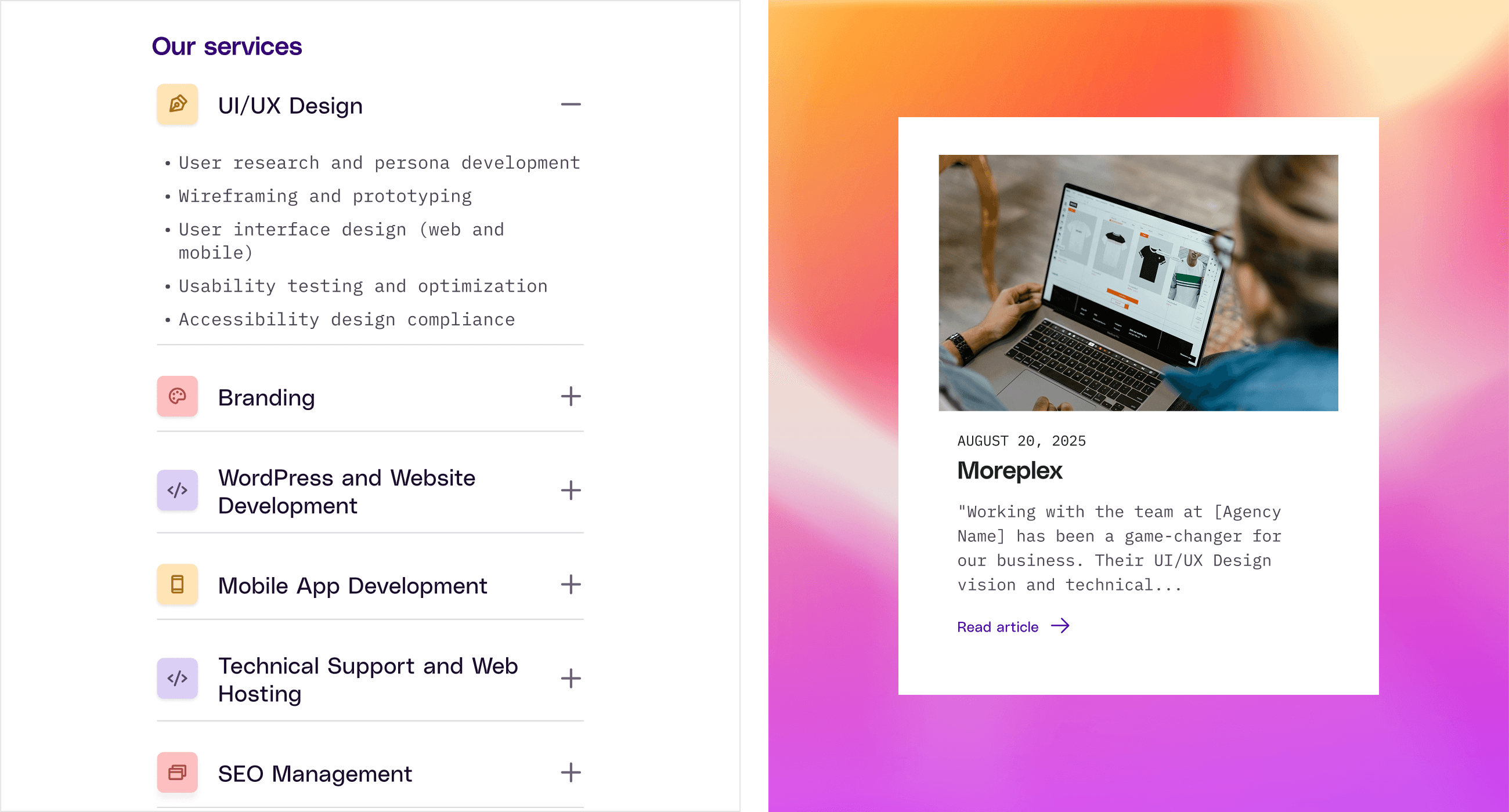 UI/UX design, Design system, Branding, Mobile design, Web design.